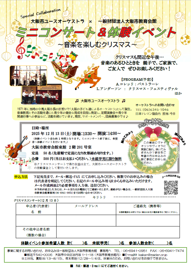 「大阪市ユースオーケストラ × 一般財団法人大阪市教育会館 ミニコンサート&体験イベント~音楽を楽しむクリスマス~(2025年12月13日)」を掲載しました